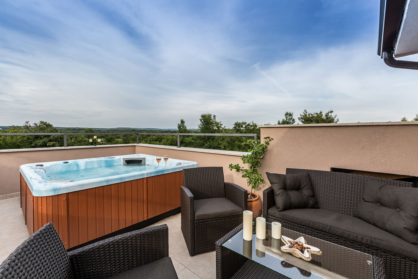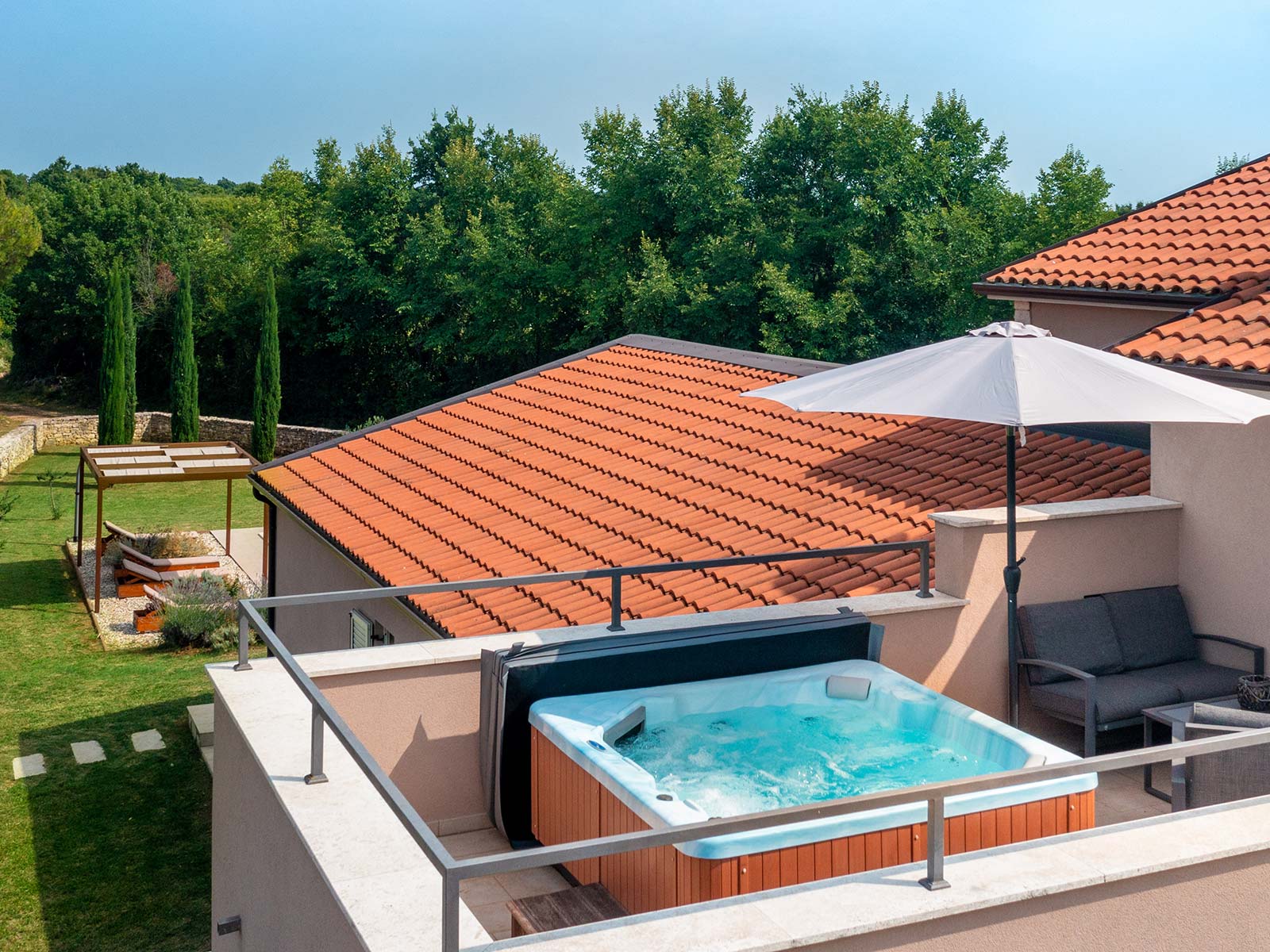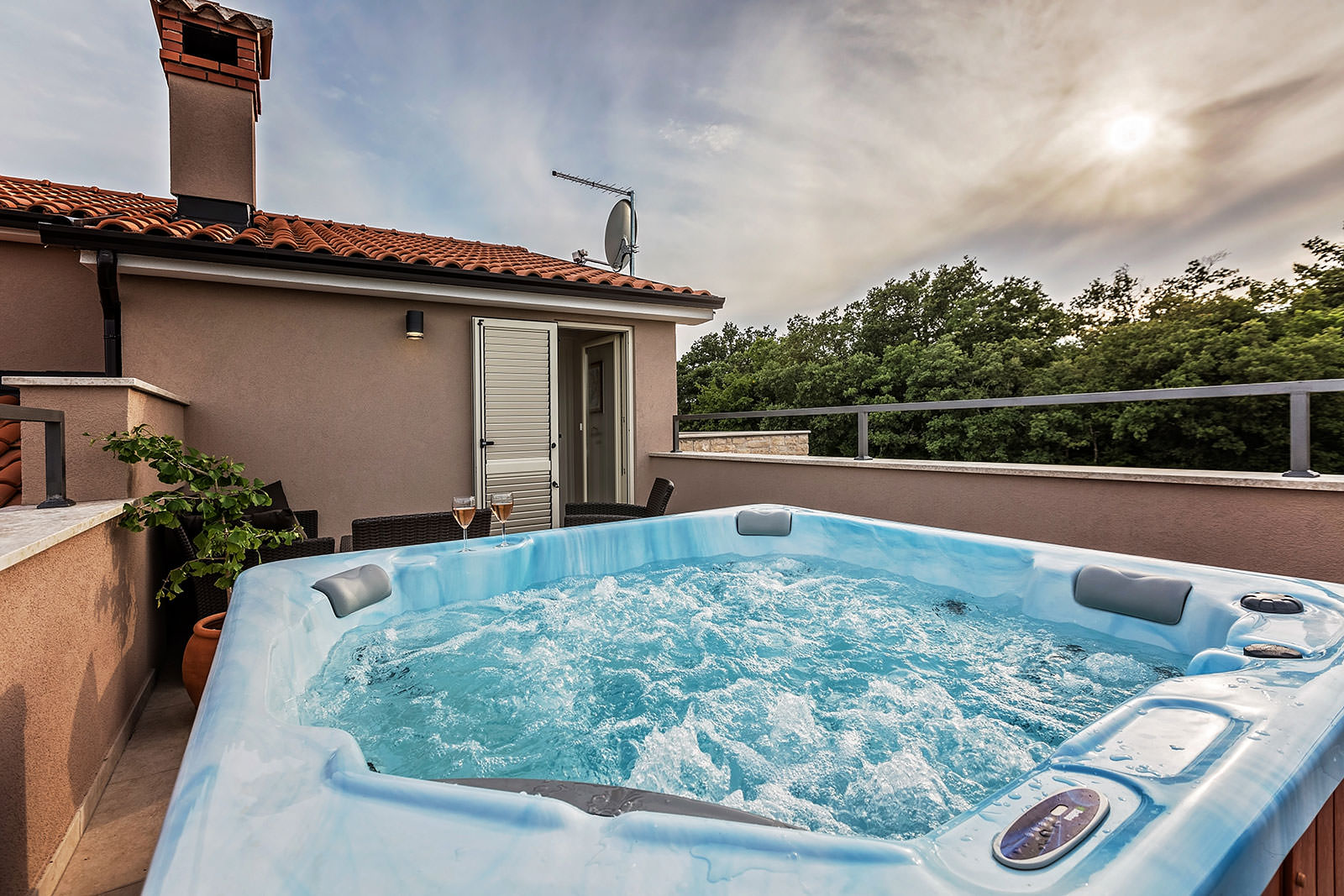 Enjoy the great view of Istrian countryside showing natural stone fences, vineyards, fruit trees and forest from the comfort of the refreshing hydro massage during summertime or relax with a hot water massage in the spring or autumn.