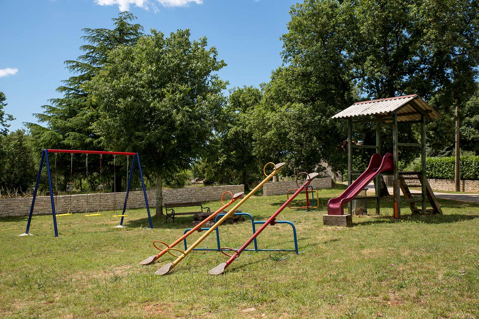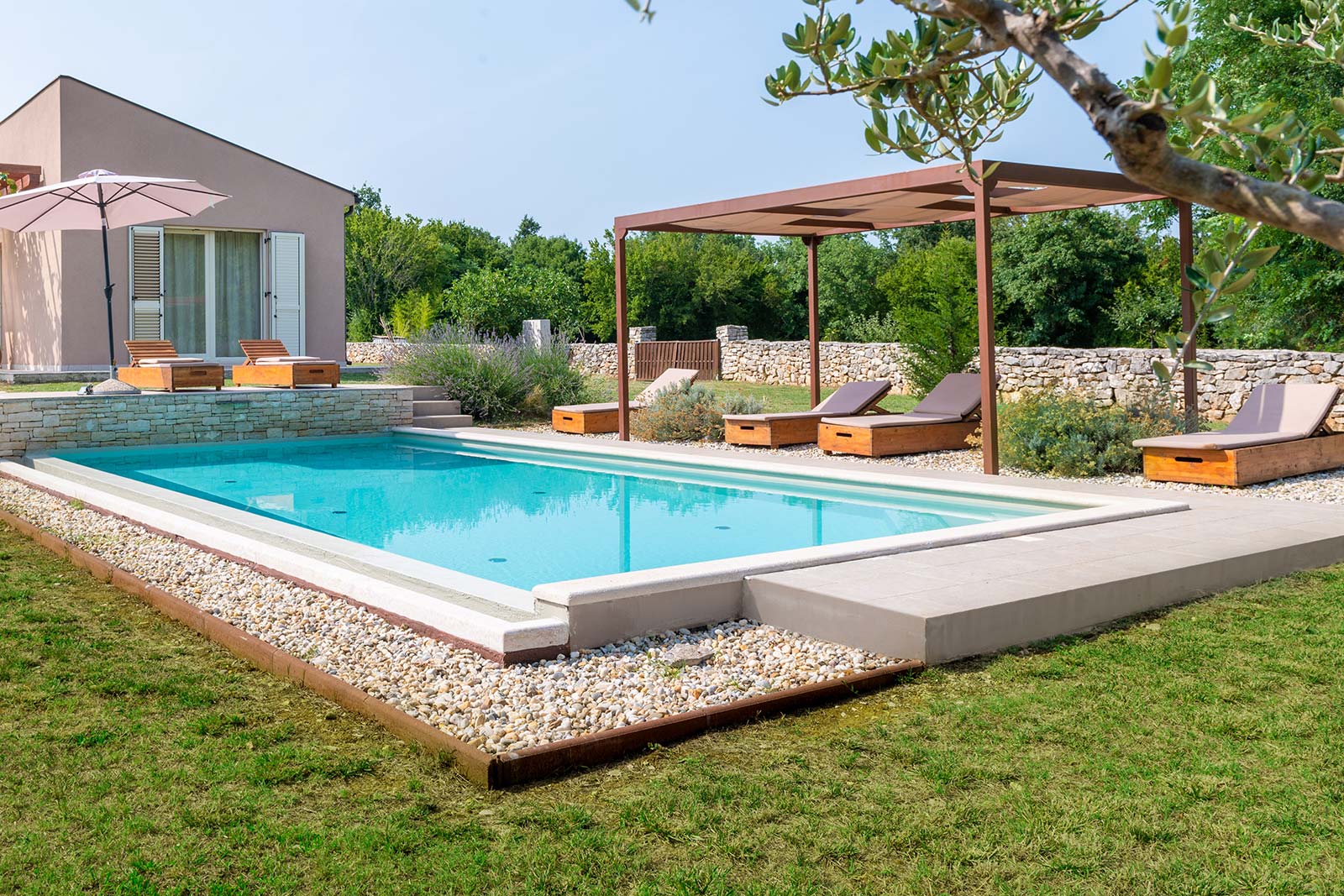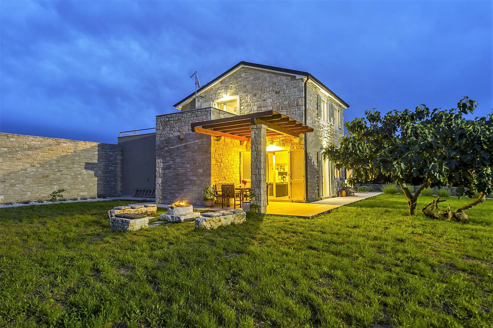 The villa is situated on an area of 2.500 m², fenced with a beautiful handmade wall of local Istrian stone and surrounded with forest and meadows. The large garden allows you to enjoy open door activities such as football, badminton and volleyball, or simply chill out and breathe the fresh air in the shade of trees of a nearby forest. Close to the kitchen, there is a small spiral aromatic garden with rosemary, sage, dill, parsley, oregano, thyme, lemon balm, mint and many other herbs… Feel free to pick a stem of spices and simply add them to your dishes. This is the most common and the most natural way to spice up your meals or enrich your cocktails with special freshness and unique flavor. There are several fruit trees on the property, and depending on the time of year, you will be able to taste the flavor of fresh picked mirabelle plums, pears, figs, quince or walnuts. Simply enjoy being immersed in nature.